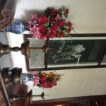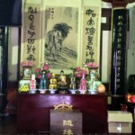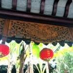 Courtyard between Great Hall and Founder’s Hall: There was a gift shop on the right, and moon-gates and red lanterns on the way to Founder’s Hall. There was also a small room on the left with what appeared to be a large beautiful ink painting of Damo (Bodhidharma) between a painting of Han Shan and Shide, as well as a black stone tablet, this time with carved images of Han Shan and Shide.