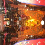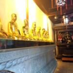 Great (Mahavira) Hall: In a traditional East Asian temple complex, the Mahavira Hall (literally: “Hall of the Great Hero”) is the main building. It is there that Gautama Buddha and other bodhisattvas are enshrined. This hall is called a hondo in Japanese. On both the east and west walls of this Great Hall, one could see the figures of the nine arhats (Buddha’s disciples) who supposedly possess various kinds of supernatural powers. Meditation in China is done sitting full lotus on a small tilted stool (see two stools at the end of photograph showing nine arhats), and with shoes on! The rubbing (inscribed paintings) of Han Shan and Shide actually dates from the T’ang Dynasty.