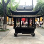 Courtyard between pagoda and a gift shop: This courtyard housed a stele (tablet) inscribed with an entire poem by a Tang Dynasty poet Zhang Ji. Behind this stele was a wall housing a larger black relief covering the entire width of the wall with carvings, apparently depicting stories from Buddha’s life. There were two large octagonal lamps on each side of the Zhang Ji “poem tablet.” There was also a large souvenir/gift shop between this courtyard and the last one.