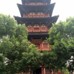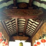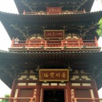 Pagoda: A pagoda is a tiered tower with multiple eaves and is found in many Asian temples. In Sanskrit, the word “pagoda” (or stupa) meant a “tomb.” Pagodas were originally built for the purpose of preserving the remains of Sakyamuni, the founder of Buddhism. Eventually, the pagodas also starting serving as shrines or monuments. At Han Shan temple, out of the pagoda’s total of five tiers (floors), only two were open to the public. The roofs were supported by dougongs (Chinese brackets). The top of the pagoda was marked by a metallic finial.