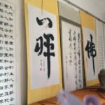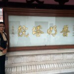 Meeting with Han Shan priests: There hadn’t been a way for us to inform the temple residents about our likely visit but on the second visit to the temple complex, we hoped to meet local shopkeepers (including Xia Lu, a talented calligrapher and ink-painter) in the hope that they might know about “Nature of Sky,” the retired former abbot whom Roshi Kangan Glenn Webb had met in 1980, or about the meditation schedule at the temple. While meandering in the area, we chanced upon a sprawling building which turned out to be the Culture Research Institute of Han Shan Temple. As she was admiring large scrolls of calligraphy mounted in this building, Mr. Yao Yan Xiang (President of the Institute) arrived, introduced himself and welcomed us to explore the entire building. Mr. Xiang presented us with two of his latest books and a long calligraphic note which described the teachings of the temple. Upon seeing the short letter in Chinese (see below) that described the connection between Han Shan temple and our sangha in the US, and the photograph of Roshi Kangan Glenn Webb with the former abbot (Nature of Sky), Mr. Xiang summoned the vice-abbot of the temple as the current abbot Qiu Shuang was out of town. While we could not communicate in English, there was a subtle joy in having found each other. Everyone confirmed that the previous abbot (“Nature of Sky”) is now 94 years old, doesn’t speak much but can sometimes comprehend what others are saying. The vice-abbot was happy to note that the Han Shan lineage had traveled to US and inquired about the details of our community in New Jersey and Boulder. The two men also had Kritee pose with the scroll of Diamond Sutra (Vajraccedike Prajna Paramita Sutra) which they had been taking along with them during their travels in Asia as they spread their teachings. They kept the letter Kritee had brought along (see below for a shortened version of the letter in Mandarin and a detailed description of Kangan’s visit in English here) for presentation to the abbot upon his return.