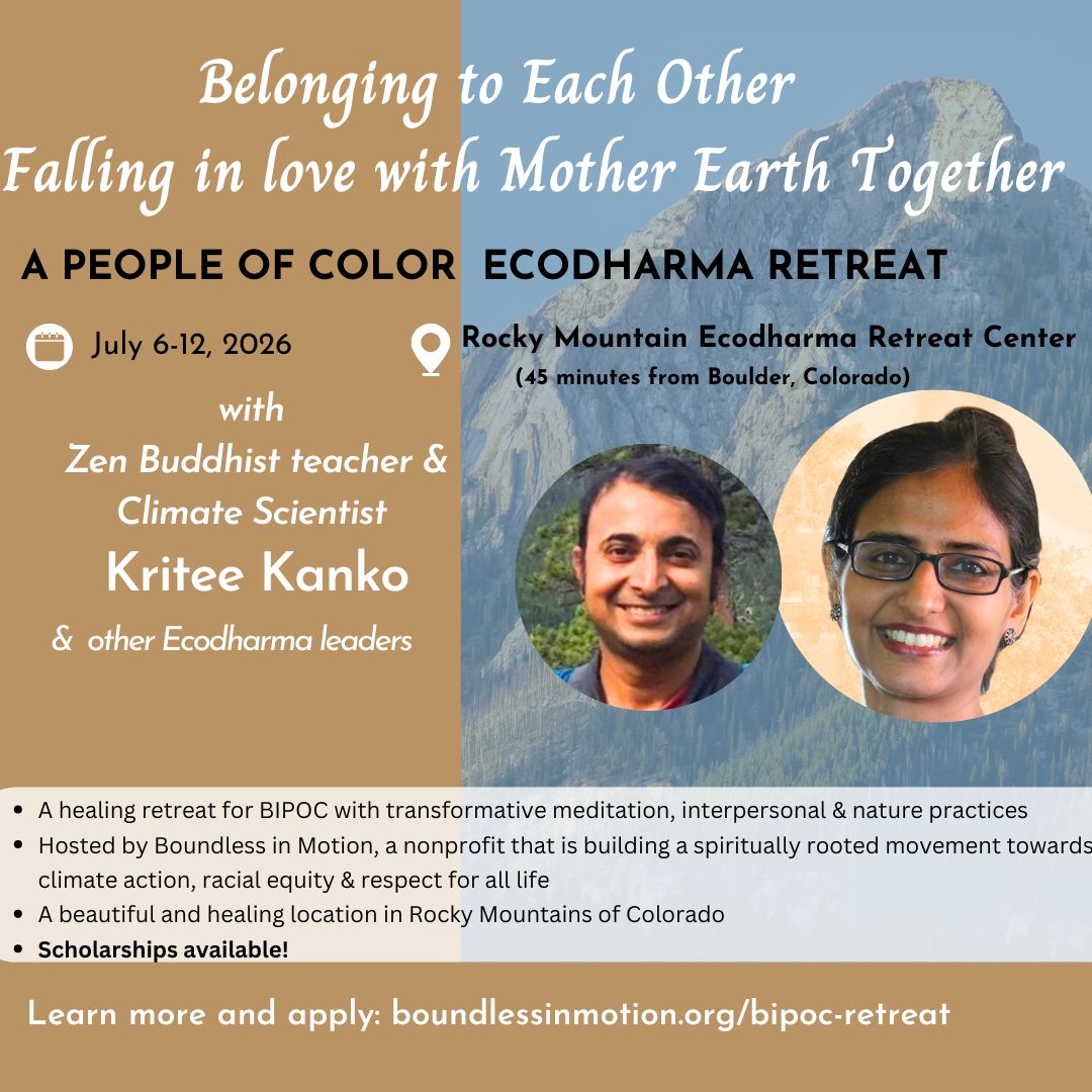 A gathering of those who self identify as people of color and work within the climate and environmental justice movement e.g., as scientists, journalists, lawyers, frontline activists, moms and/or teenagers.At Rocky Mountain Ecodharma Retreat Center